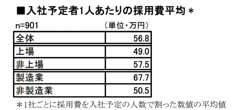 2024年のマイナビによる調査では、新卒採用単価の平均が56.8万円と発表されています。一人あたりの新卒採用コストは、母集団形成のしやすさや必要な施策の数によって変動します。