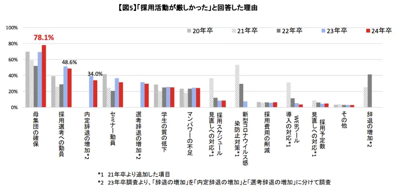 2024年卒の採用活動では約8割の企業が母集団形成に難しさを感じ、予定していた人数を確保できない状況です。2026年卒の調査でも同じような傾向が見られ、企業は追加施策や選考回数の増加といった内部工数が増加しています。