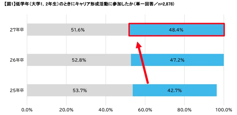 オープン・カンパニーの対象者は、大学生の全学年です。年々、低学年のうちからキャリア形成活動に参加する学生の割合は増え、マイナビの調査では2027年卒では約半数の学生が参加したと答えています。