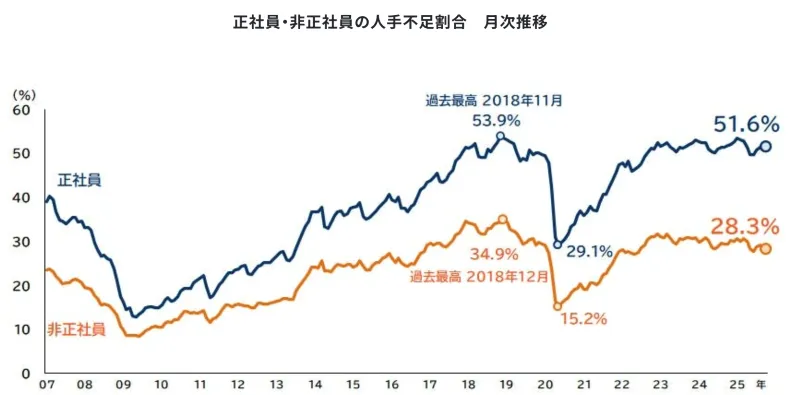 2025年現在、帝国データバンクの調査に回答した企業の約半数が、正社員の不足を感じている状況です。
